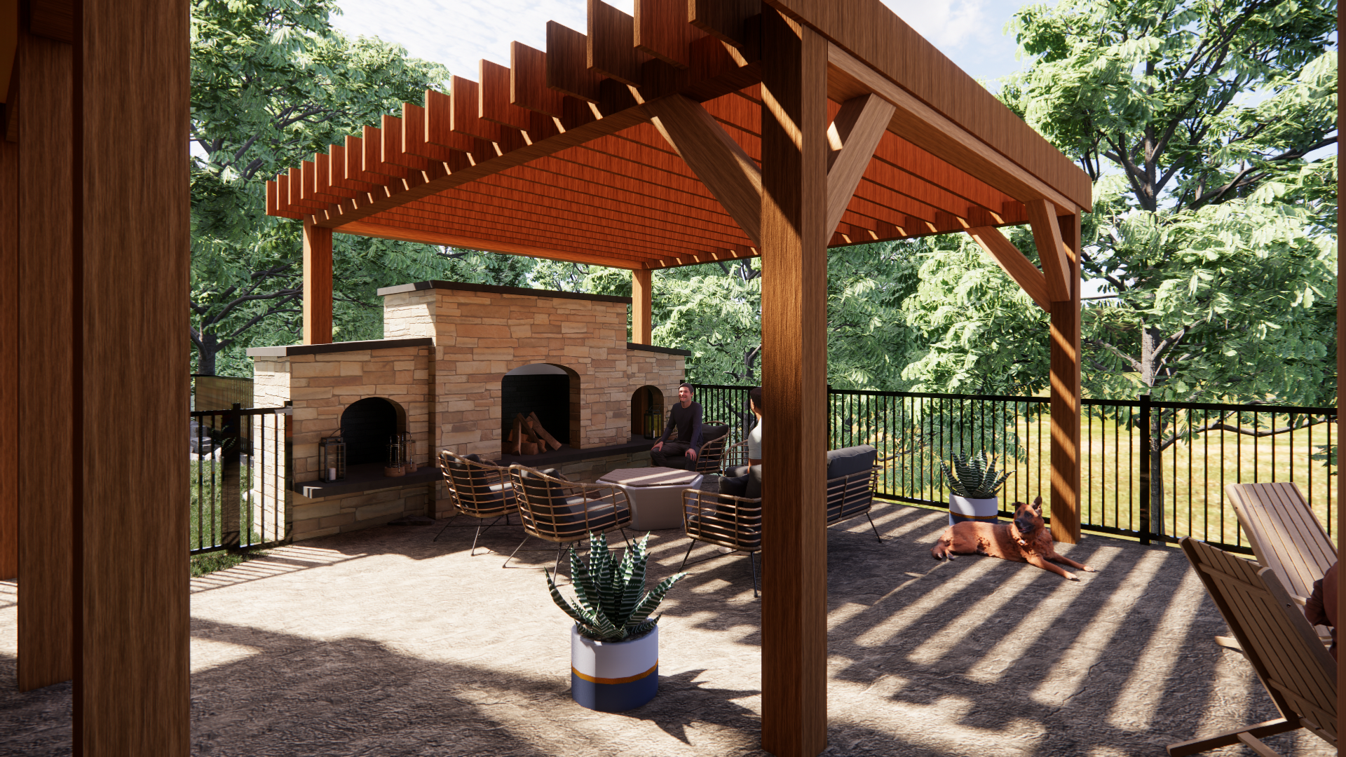 A swim spa and outdoor living room addition to a secluded lake house surrounded by tall trees. The outdoor living area is anchored by a large stone fireplace and a rustic trellis above. Beyond the swim spa is a set of stairs to take you down to a private fire pit nestled in the trees and boulders.